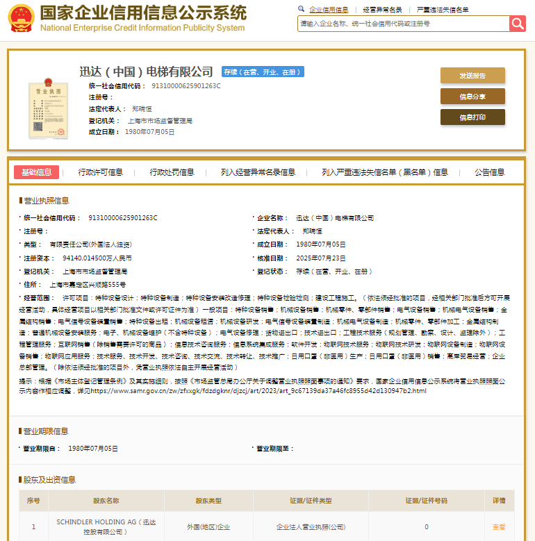 国家企业信用信息公示系统显示,迅达(中国)电梯有限公司深圳分公司成立于2002年,负责人邵剑国。其母公司——迅达(中国)电梯有限公司则成立于1980年,注册资本94140.0145万元人民币,法定代表人为郑瑞恒,由SCHINDLER HOLDING AG(迅达控股有限公司)全资持股。