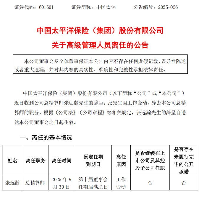 10月10日,巨潮资讯网公开信息显示,中国太平洋保险(集团)股份有限公司发布关于高级管理人员离任的公告,公司总精算师张远瀚先生因工作变动,辞去本公司总精算师的职务。