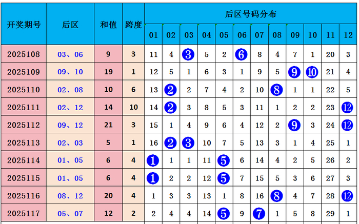 后区分析:上期后区开出05 07,和值12,较上期和值下降,本期预计和值会上升,看好号码08 12,和值20。